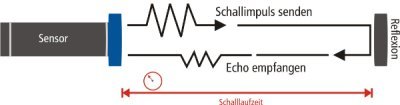 Ultraschallsensoren erfassen Abstände nach dem Prinzip der Laufzeitmessung hochfrequenter Schallimpulse. Die zyklisch ausgesendeten Impulse breiten sich mit Schallgeschwindigkeit im Raum aus und werden beim Auftreffen auf Objekte reflektiert. Das dabei entstehende Echo wird vom Sensor erfasst, woraufhin der Abstand aus der zeitlichen Differenz zwischen Senden und Empfangen berechnet wird. Für die korrekte Funktionsweise des Sensors ist es dabei unerheblich, ob der Gegenstand aus Metall, Holz oder Kunststoff besteht.